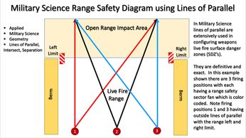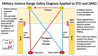 The real world military science applications applied directly relate from Military sciences real world applications. Included are uses of applied geometry for this application. There is both a manual and computerized version for determining weapons sector range fans. The computerized version is called ArGIS. Calculating and determining safety is an exact science, and there is no room for error in these applications, because lives depend on its safe practice every day. Also very important are the lines of parallel or the left and right limits, lines of intersect, they are very definitive in this application of military science. This is why military science may mention heliocentric science in some of its manuals but never apply it in its real world applications. Now see if you can pick out the visual perspective items in this and the next diagram where STO and SIMO applications were developed from.