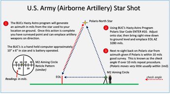 Hasty Astro method of lay or emplacing survey is both very accurate and can be done in relatively short period of time. This method of lay uses both sun in the day time or stars such as Polaris at night time. You will note these are extreme distances when using the sun and stars for this method of lay. Lensing and refraction are excluding at these extreme distance because of the second M2A2 aiming circle called the safe circle verifies the survey data using an alternate method of lay typically magnetic. Both circles must be within 10 mils of each other, they typically are within 1-2 mils 99.9% of the time. There are 17.8 mils in one degree.